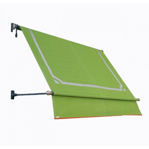 Tenda a caduta con braccetti laterali in ferro battuo, tettuccio in alluminio su richiesta, realizzata solo nel colore nero antracite. Manovra con argano, motorizzabile, inatallazione a parete.