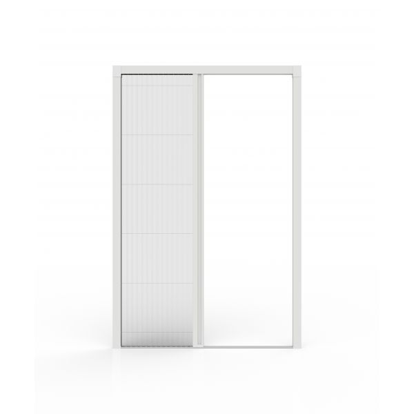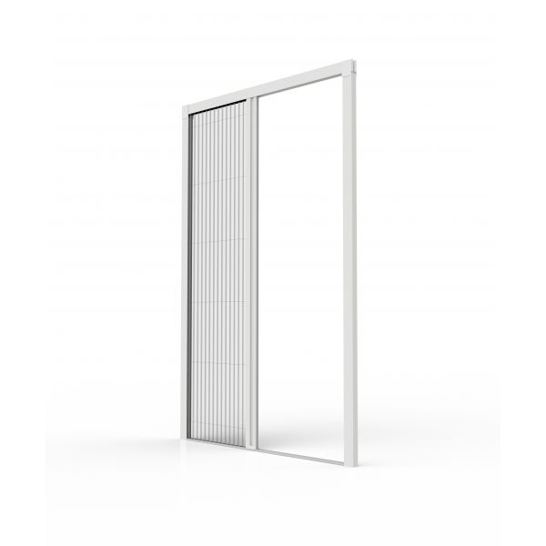Zanzariera con apertura a trascinamento laterale grazia al quale la barra maniglia si ferma nella posizione desiderata.